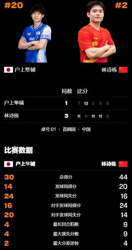 重要的第三局,林诗栋的反手拧拉愈加坚决,得胜放弃住了户上隼辅的上手,在2平之后径直连得9分,以11-2的悬殊比分,击溃了户上隼辅,领先干涉到了我方的赛点局。
